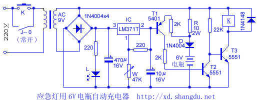 | 选择分类:当前分类——常用资料 相关联或者相类似的文章: 电鱼机电路图大全(404) PT2262/2272编解码集成电路介绍(402) yudongyang制作的雕刻机(402) 集成运算放大器的单电源供电电路(401) 互补管脉冲电路(401) 23. 模拟计算器数字输入及显示(400) GG帐号被K,厚着脸皮抗议到底!(400) 应急灯用6V电瓶自动充电器 (399) 电池使用小常识(398) VBScript 函数 (397) 自己做红外遥控接收装置 (396) 运算放大器的实验(396) 电路板厂电路板样品图片欣赏(396) 省电实用的电话灯(395) 对一个电学实验的又一改进(392) 岩石中的动物(391) 非法传销组织的“洗脑”骗术五(390) 正则表达式(390) 常用接口电路及其编程(389) 连接IDE设备时的注意事项 (388) 首页 前页 后页 尾页 本站推荐: | 应急灯用6V电瓶自动充电器 市面上出现的6V电瓶供电的应急灯,随机配的充电器过于简单,长时间工作发热严重、易烧毁。充电时还容易造成电瓶过充,引起电解液过早干涸而缩短电瓶寿命。针对这一缺点,笔者将其改成自动充电器,经半年多使用,效果良好,电路如下图所示: