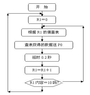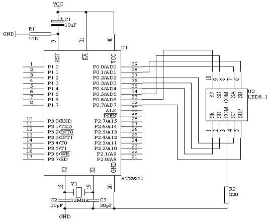 如图13所示,利用AT89S51单片机的P0端口的P0.0-P0.7连接到一个共阴数码管的a-h的笔段上,数码管的公共端接地。在数码管上循环显示0-9数字,时间间隔0.2秒。