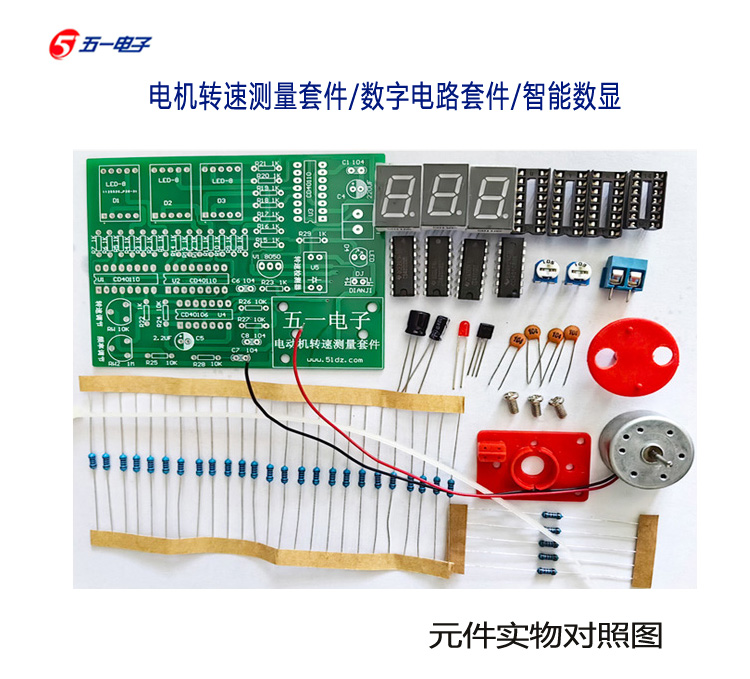 数字电路电机转速测量套件可以测量电动机每秒转动多少圈,最大测量范围每秒转动999圈,简单的修改电路,还可以当电子计数器使用。收到的实物包括印刷电路板(不要印刷电路板可配万能板)、小电机、电机转盘透光孔、光电传感器、3块CD40110、1块CD40106等看到的这些元件。