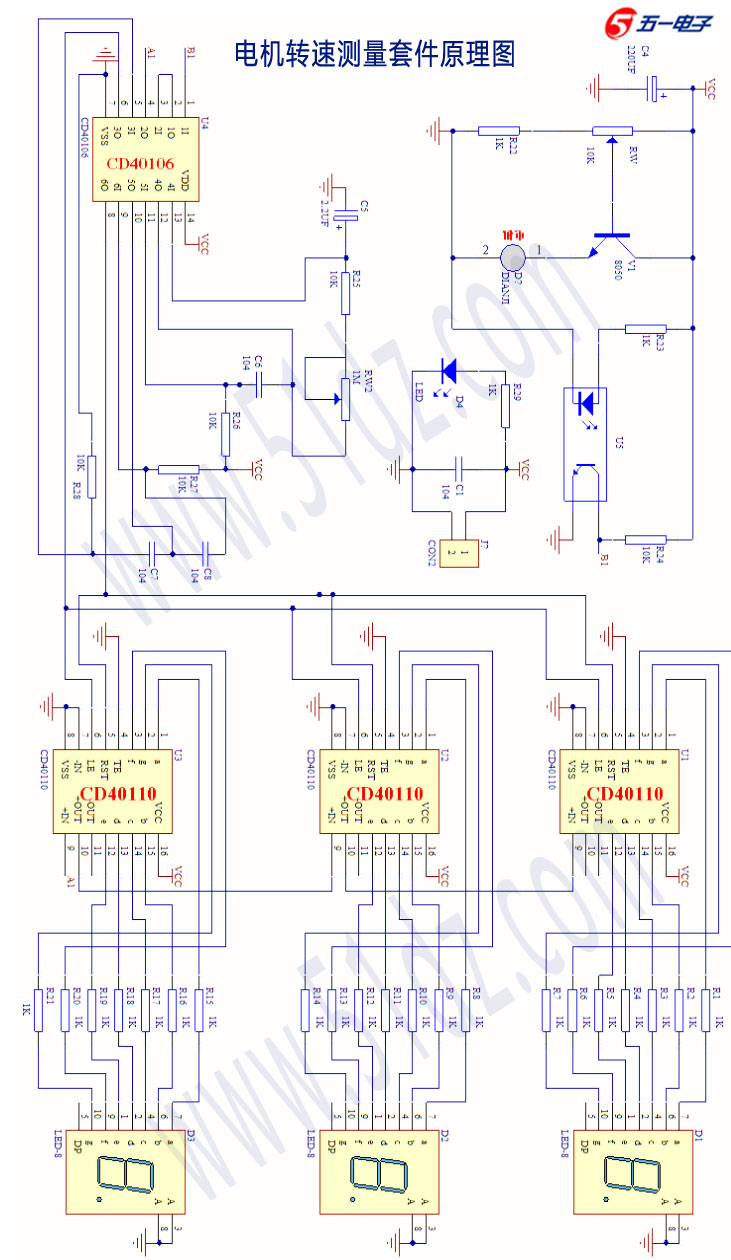 安装好后,调节W 1M的阻值,使振荡周期在1秒。本套件赠送有电动机、转盘透光孔、红外光电传感器,按原理图安装后,调节W10K可以改变电机的转速,让电机带动转盘透光孔经过红外光电传感器中央,这样就可以检测并显示电机转速,如果要想到电机每分钟的转速,可以将振荡周期调为60秒(需要将C5加大到100UF以上后再调R28),同时千位数用人工计数,当然,也可以用电机的每秒转速乘以60,或者每6秒的转速乘以10。 下面是改版后的原理图